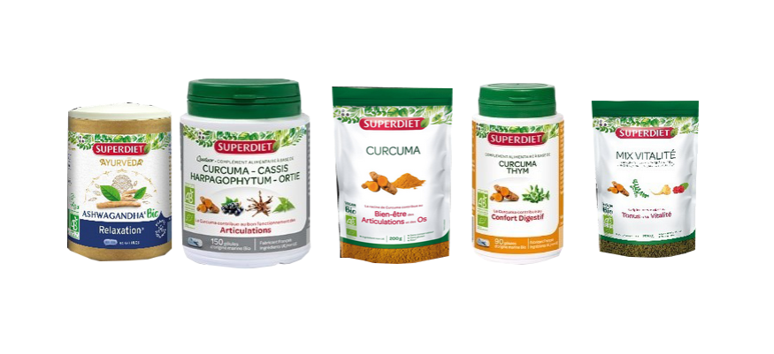 Rappel des produits suivant: Curcuma Bio 200g ( Lot 59624 ), Mix vitalité Bio 200g (lot 61580), Ashwagandha Bio 60 gélules ( lots 64909 et 71824),QUATUOR ARTICULATION Bio 150 gélules. (lot 72934), Curcuma thym Bio 90 gélules (lots 69773 et 72776)