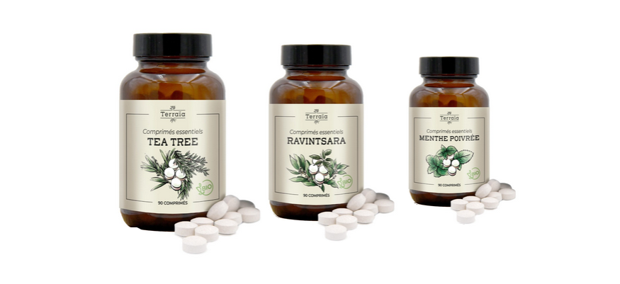 Comprimés essentiels Menthe poivrée Bio - 90 comprimés ( lot BIU1004), Comprimés essentiels Ravintsara Bio - 90 comprimés ( lot BIU1005), Comprimés essentiels Tea tree Bio - 90 comprimés (lot BIU 1007)